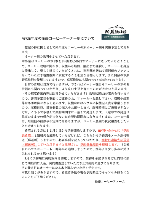 本日より令和8年度コーヒーの木オーナー予約申込受付を開始します!